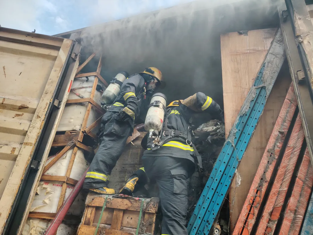消防員利用穿刺水槍深入貨物堆垛內(nèi)部進行冷卻