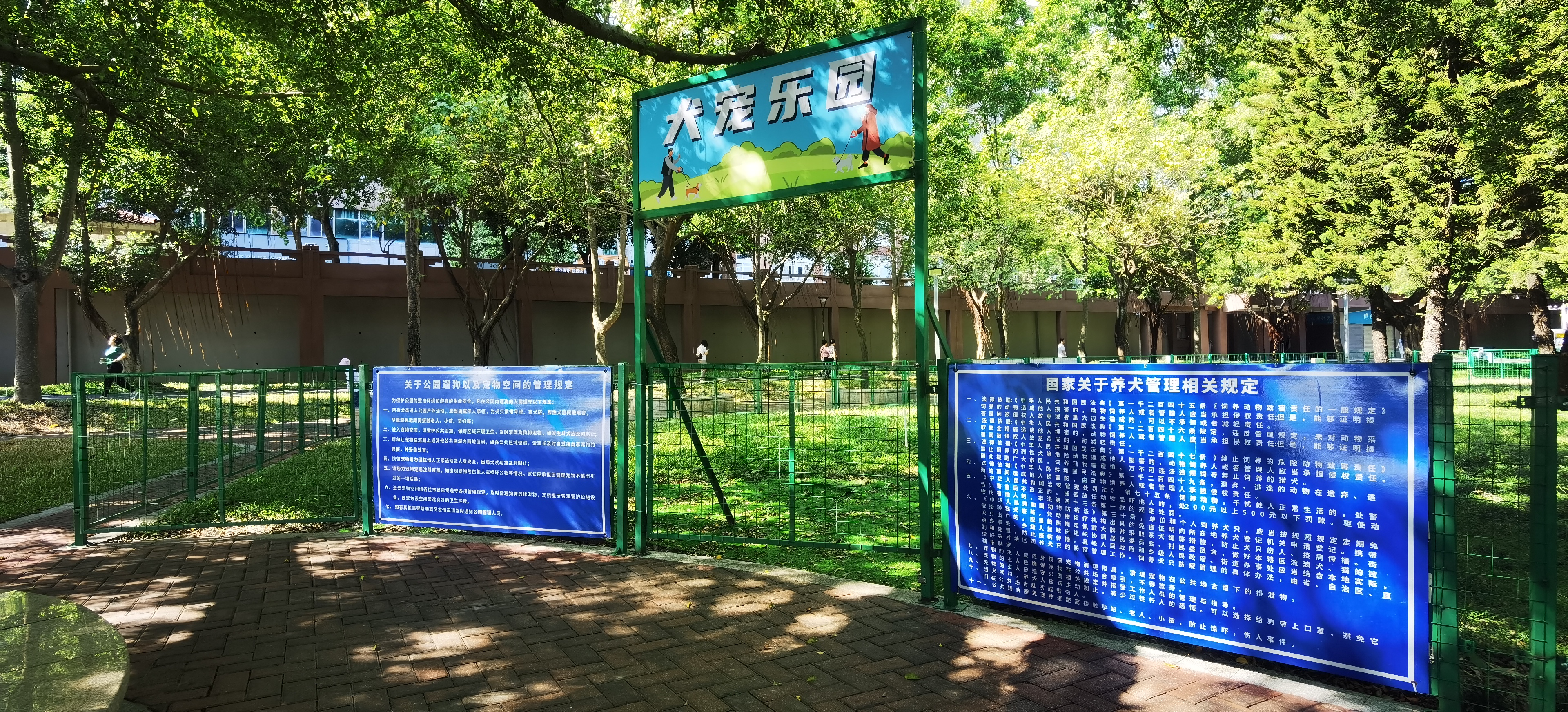 在市區(qū)濱江公園北廣場(chǎng),設(shè)置了一處面積約200平方米的犬寵樂(lè)園,四周用鐵網(wǎng)圍蔽,供犬只不拴繩自由活動(dòng),滿足犬只飼養(yǎng)者希望寵物交流、玩耍的客觀需求,圍欄上還張貼了國(guó)家關(guān)于養(yǎng)犬管理相關(guān)規(guī)定、關(guān)于公園遛狗以及寵物空間的管理規(guī)定。