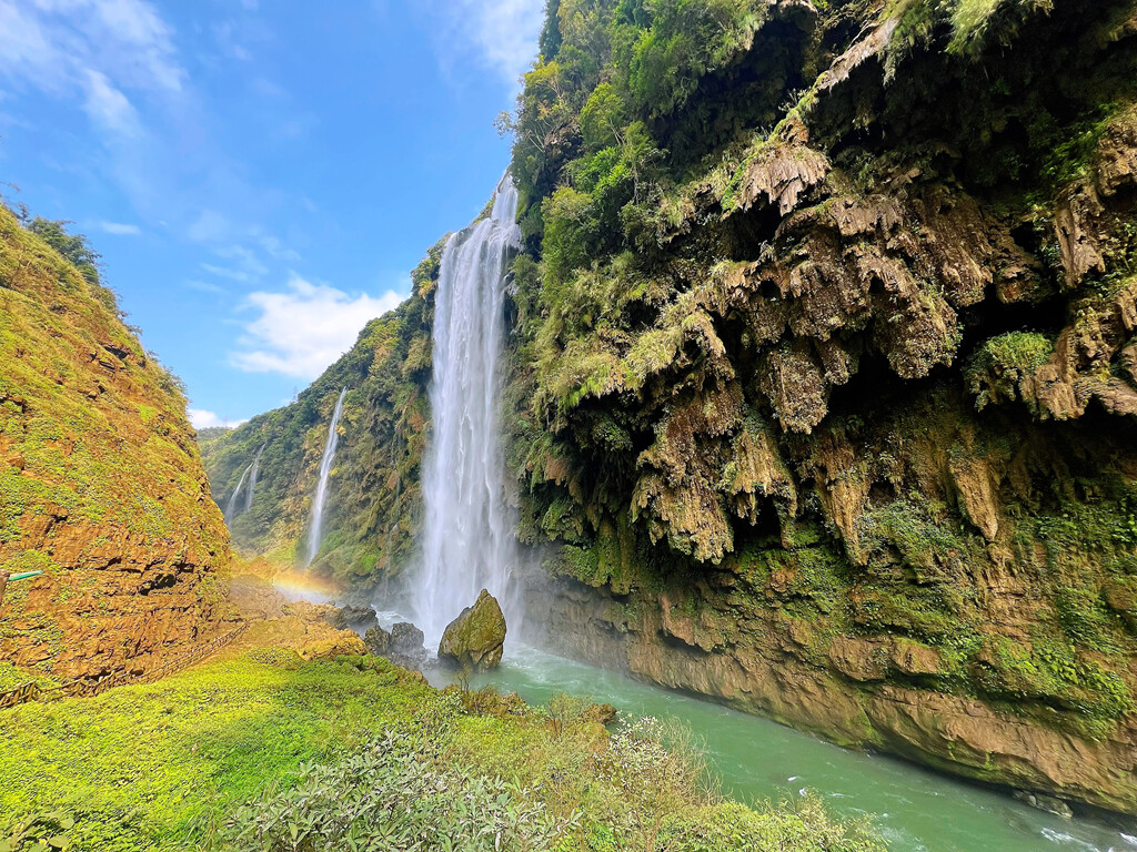 馬嶺河峽谷是喀斯特多層次地貌景觀的集中表現(xiàn),集雄、奇、險(xiǎn)、秀、幽、壯、美于一體,谷底空氣負(fù)氧離子含量最高可達(dá)到30萬(wàn)/立方厘米。這個(gè)“地球上最壯觀最美麗的城市峽谷”,多條瀑布從落差200多米的懸崖傾瀉而下,聲震如雷,水霧彌漫。宏偉壯觀的瀑布群下,有30萬(wàn)平方米的巖頁(yè)壁掛分布在峽谷的兩岸,它們一蓬蓬地附掛在峭壁上,有的像靈芝,有的像木耳,有的像雄鷹展翅,有的像荷葉伸展,極具觀賞價(jià)值、研學(xué)價(jià)值和科考價(jià)值。