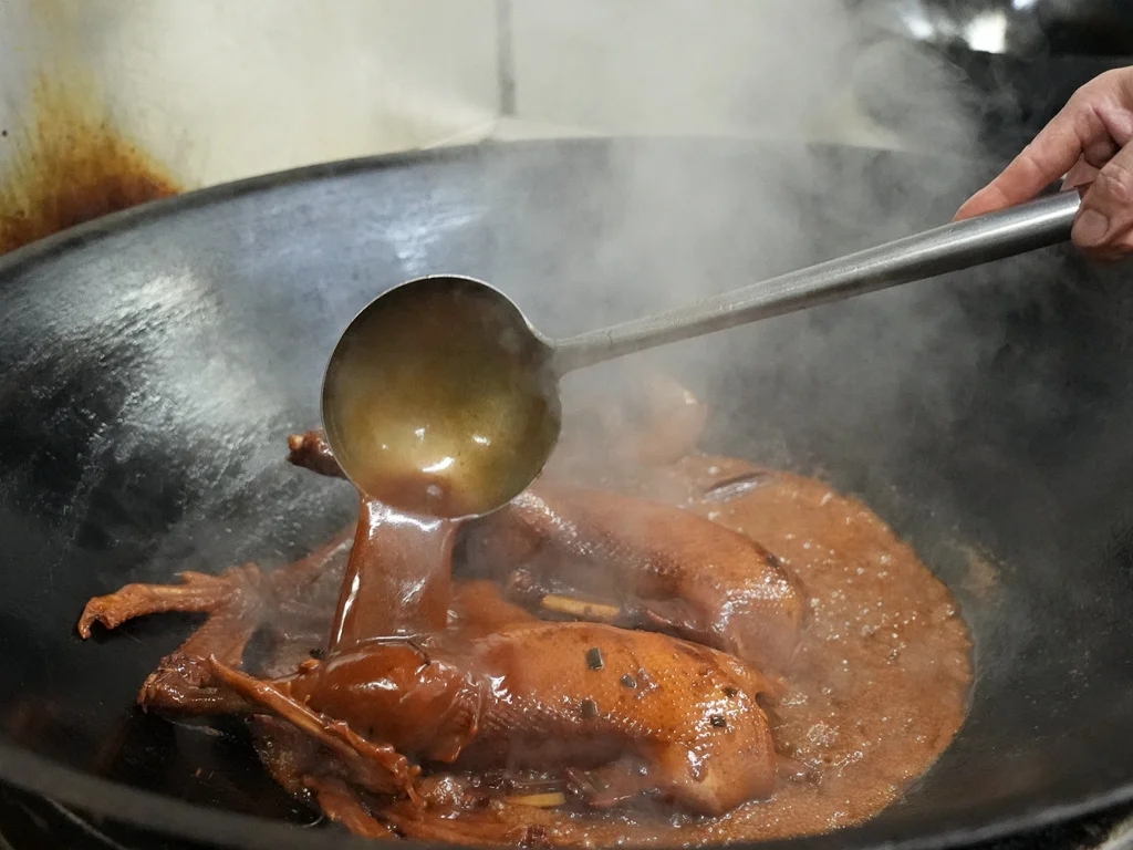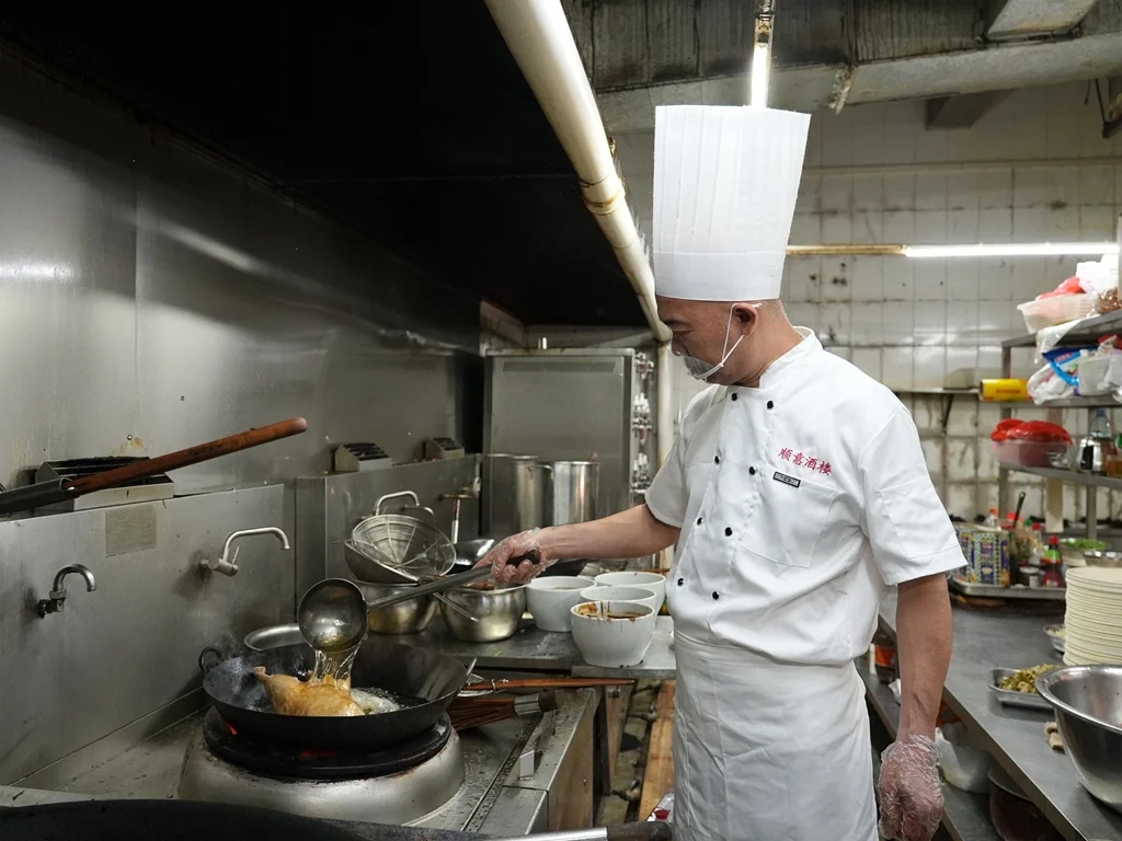 大廚張旭輝用心烹飪著他的拿手好菜——瀝林碌鵝。