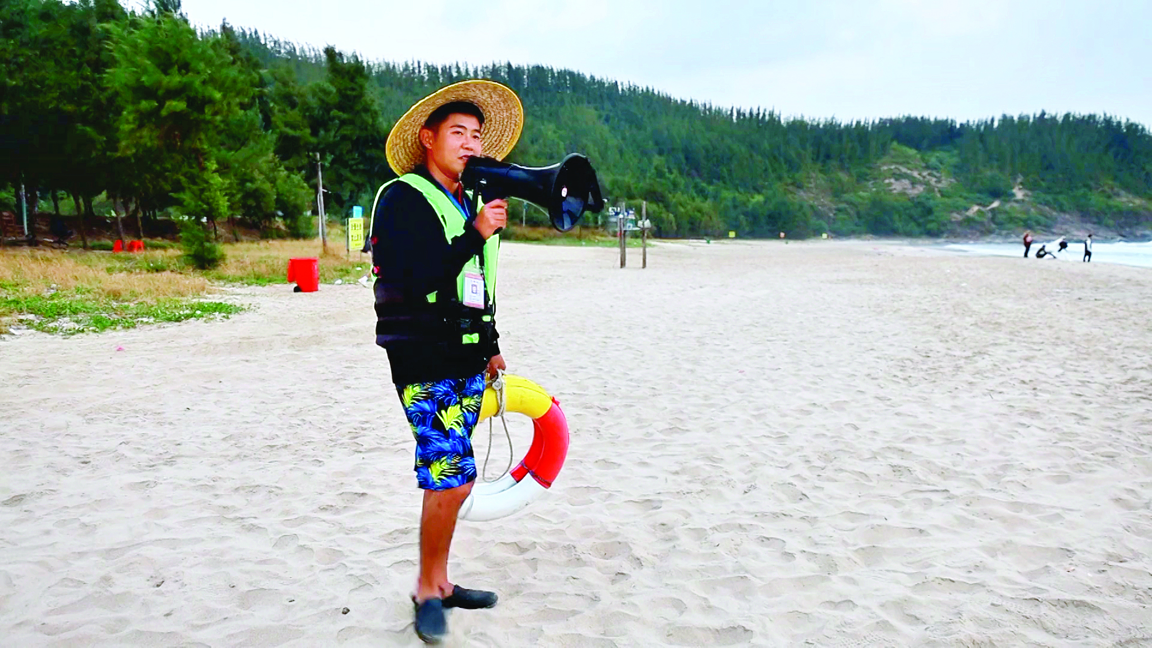 楊守源在黑排角海邊宣傳防溺水。惠州日?qǐng)?bào)記者湯渝杭 攝