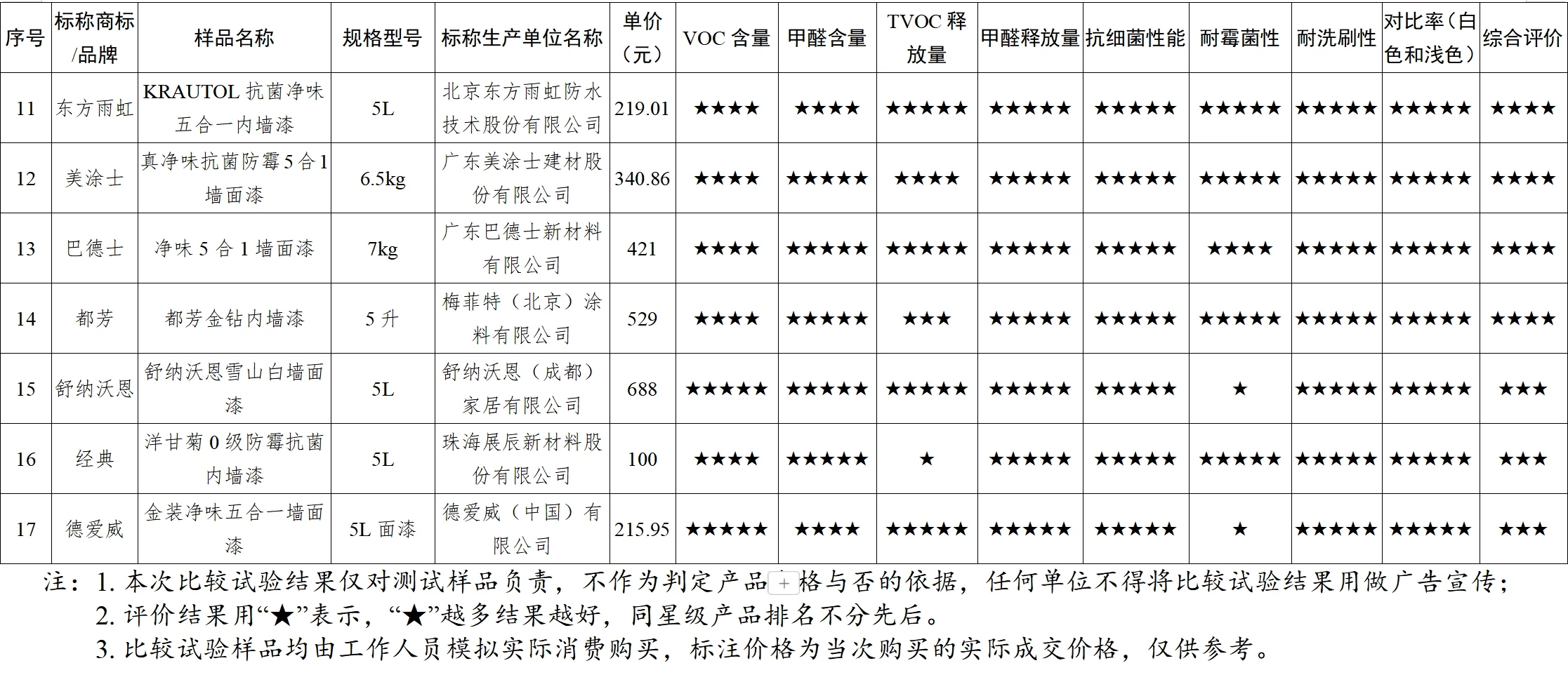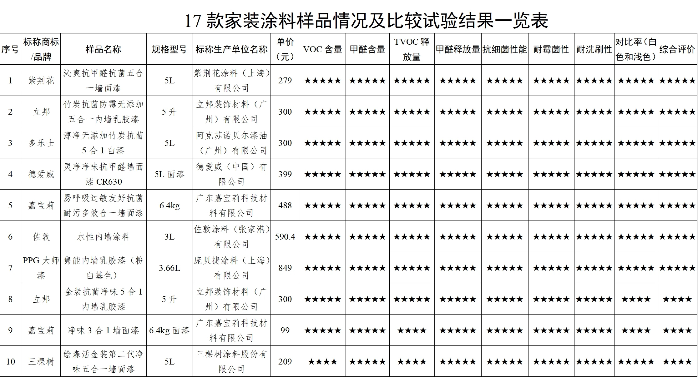 市面上的內(nèi)墻涂料安全嗎?甲醛含量如何?在潮濕高溫的天氣容易發(fā)霉嗎?如何選購(gòu)優(yōu)質(zhì)的涂料產(chǎn)品?為深入了解家裝涂料產(chǎn)品質(zhì)量狀況,更好指導(dǎo)消費(fèi)者科學(xué)消費(fèi),近日,廣東省消委會(huì)聯(lián)合惠州市消委會(huì)對(duì)17款內(nèi)墻涂料開(kāi)展比較試驗(yàn)并發(fā)布《家裝涂料比較試驗(yàn)報(bào)告》,報(bào)告根據(jù)比較試驗(yàn)結(jié)果,對(duì)17款樣品進(jìn)行了綜合評(píng)價(jià),其中綜合評(píng)價(jià)五星的樣品有7款,四星的有7款,三星的有3款。