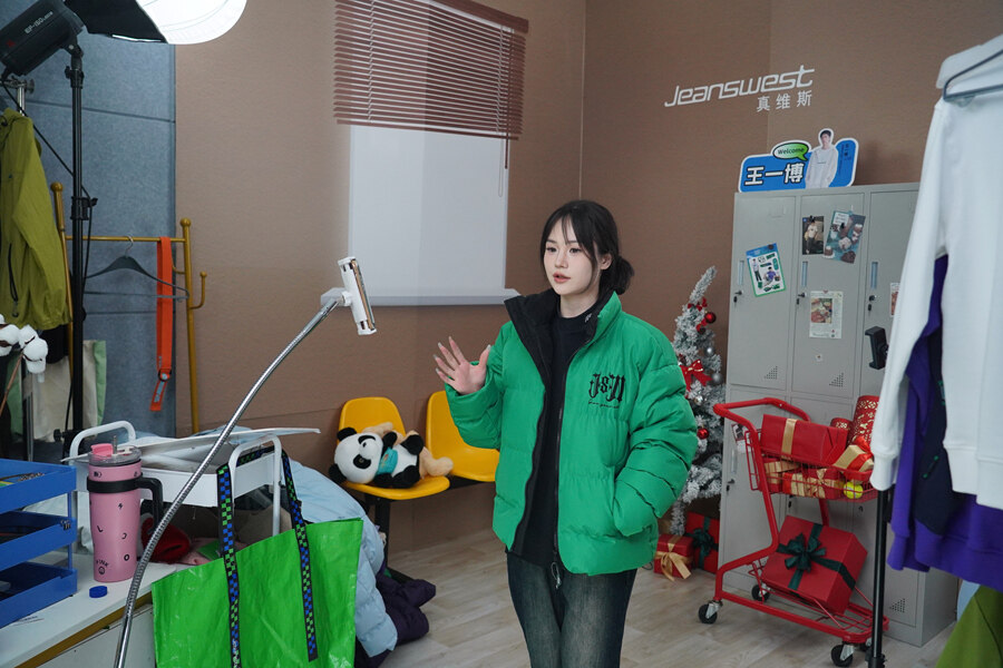 在真維斯線上的銷售直播間內(nèi),主播正在直播。