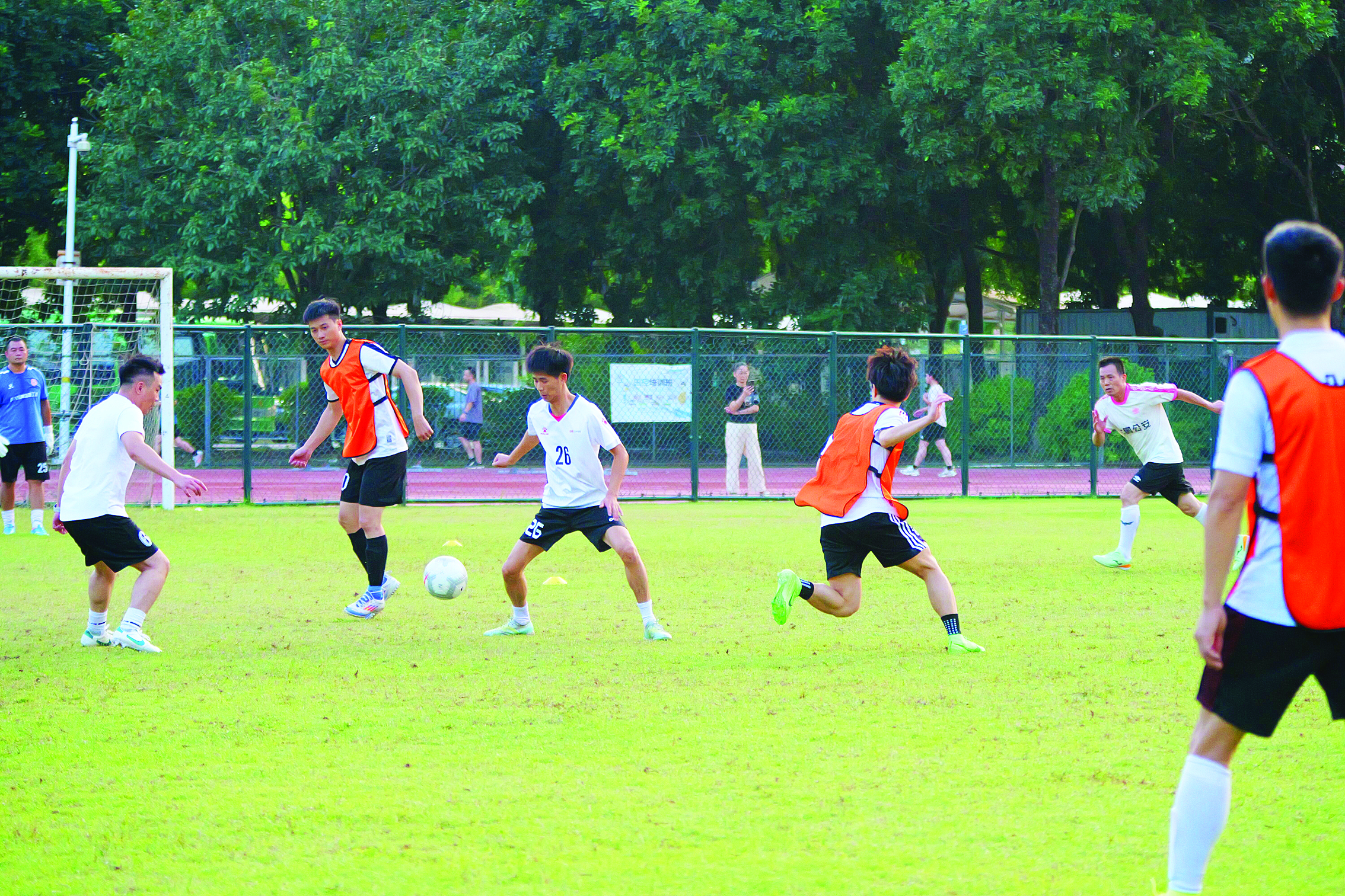 進(jìn)行了5對(duì)2搶球、8對(duì)8半場(chǎng)攻防、傳球后搶點(diǎn)射門等科目訓(xùn)練