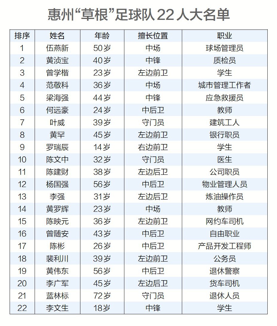 將代表惠州迎戰(zhàn)香港明星足球隊(duì)的惠州“草根”足球隊(duì)22人名單,已于11月15日正式公布。這22人來自全市的各行各業(yè),其中最年長(zhǎng)的是72歲的退休人員,最小的則是只有14歲的學(xué)生。12月15日,由他們組成的惠州“草根”足球隊(duì),將與女子足球隊(duì)一起在惠州奧林匹克體育場(chǎng)對(duì)陣香港明星足球隊(duì)。