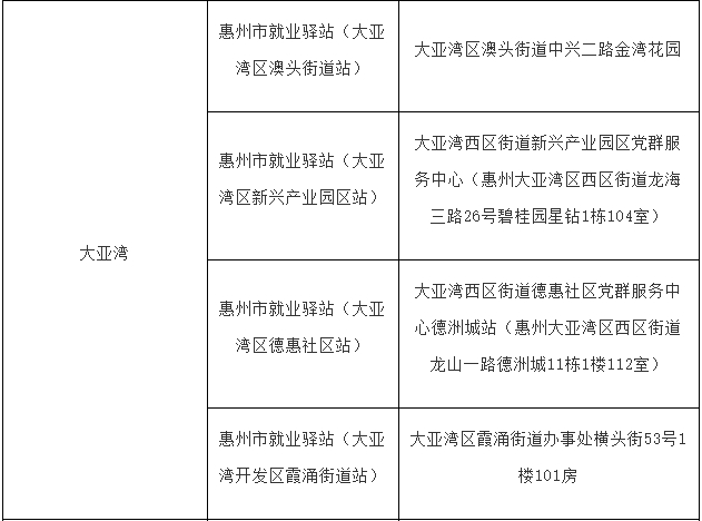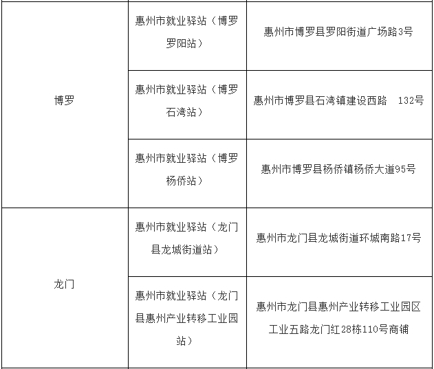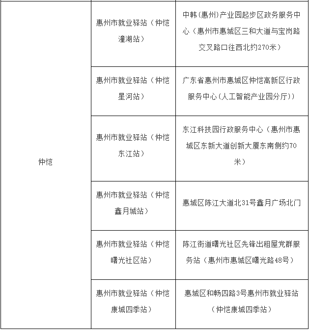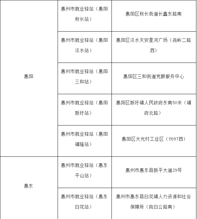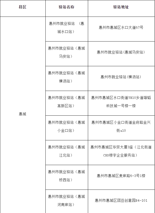 惠州市就業(yè)驛站已建成站點一覽表