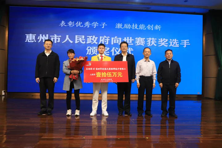11月22日,惠州市人民政府向世賽獲獎(jiǎng)選手頒獎(jiǎng)儀式在廣東省技師學(xué)院舉行,為第47屆世界技能大賽可再生能源項(xiàng)目銀牌獲得者、惠州籍選手、廣東省技師學(xué)院學(xué)生曾振江頒獎(jiǎng)。惠州市人民政府給予曾振江15 萬(wàn)元獎(jiǎng)勵(lì)。