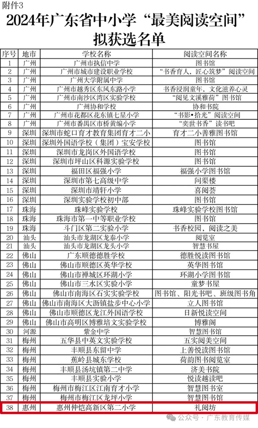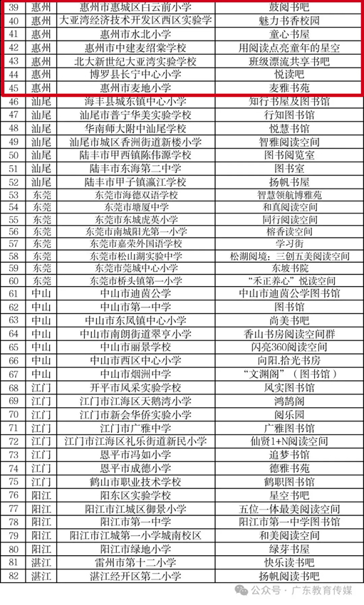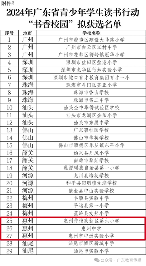 根據(jù)教育部辦公廳《關(guān)于開(kāi)展2024年全國(guó)青少年學(xué)生讀書(shū)行動(dòng)區(qū)域優(yōu)秀案例征集活動(dòng)的通知》(教基廳函〔2024〕30號(hào))和《廣東省教育廳關(guān)于開(kāi)展2024年廣東省中小學(xué)“書(shū)香校園”建設(shè)系列活動(dòng)的通知》精神,經(jīng)組織專(zhuān)家嚴(yán)格評(píng)審,擇優(yōu)遴選出2024年廣東省青少年學(xué)生讀書(shū)行動(dòng)區(qū)域優(yōu)秀案例5個(gè)擬推薦教育部;“書(shū)香校園”61所(其中,惠州有3所);2024年廣東省中小學(xué)“最美閱讀空間”120個(gè)(其中,惠州有8個(gè)),F(xiàn)將名單予以公示,公示期為2024年11月20日至2024年11月27日。