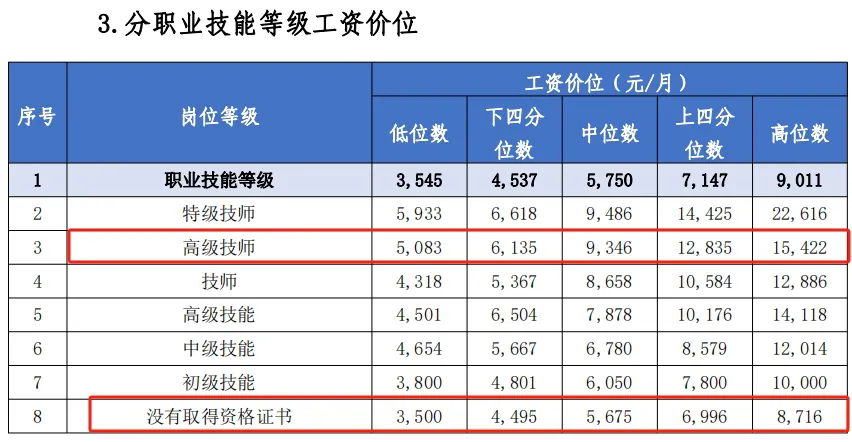 例如,高級(jí)技師(一級(jí))的工資中位數(shù)為9346元/月,而沒有取得資格證書的中位數(shù)為5675元/月,相差3671元/月。