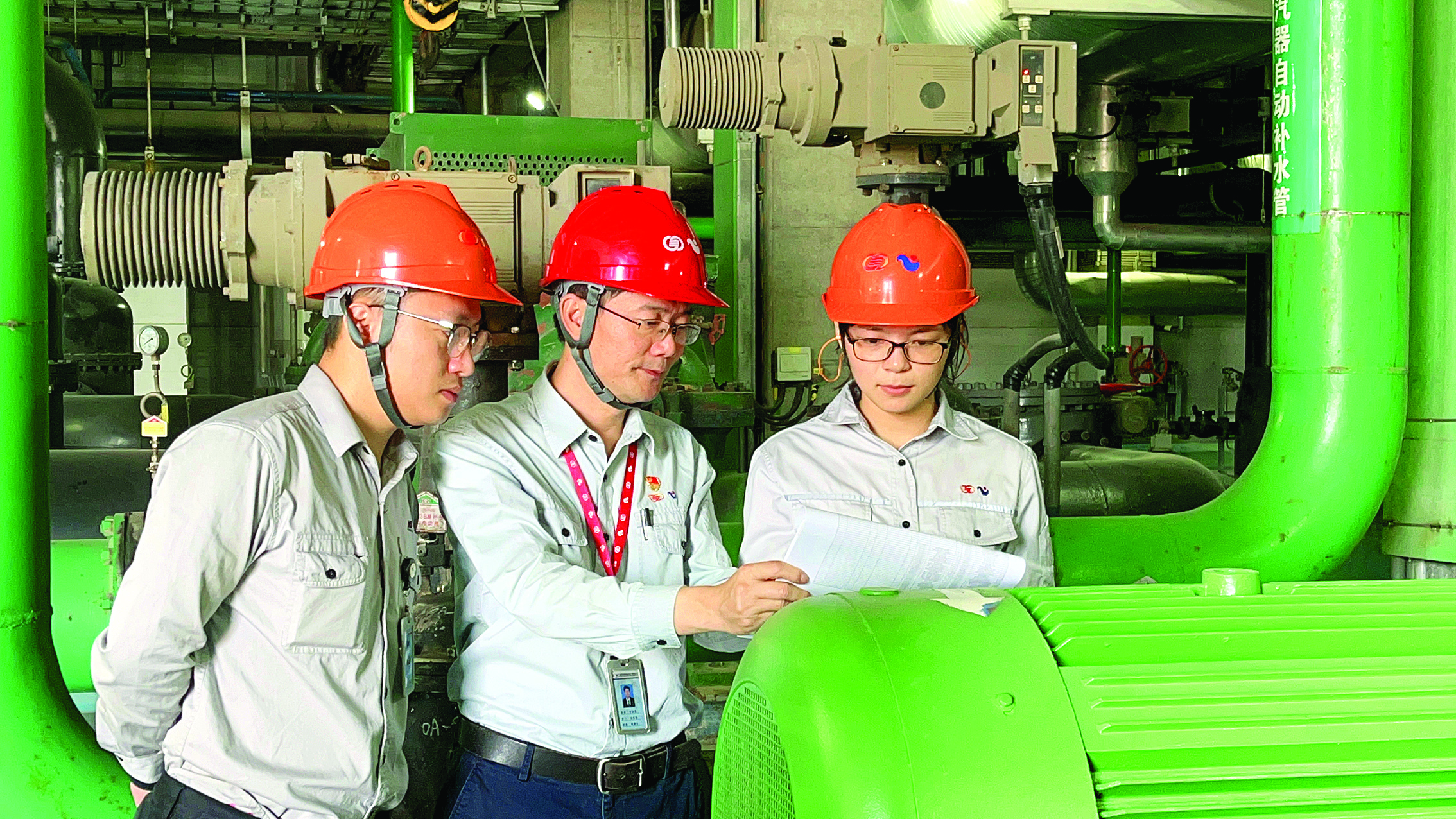 甘文亮(中)指導(dǎo)年輕技術(shù)人員開展設(shè)備巡維。圖片由受訪者提供
