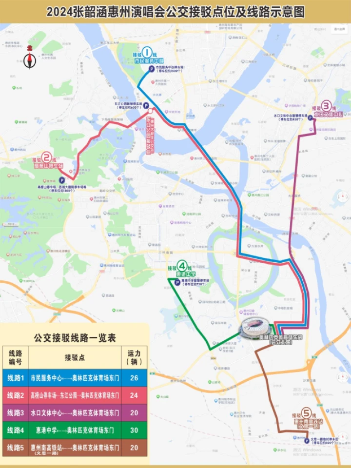 演唱會當(dāng)天,市區(qū)將設(shè)置6個公交接駁點。其中江北街道2個(市民服務(wù)中心、東江公園停車場)、水口街道1個(水口文化體育中心停車場)、龍豐街道1個(高榜山停車場)、河南岸街道1個(惠港中學(xué)停車場)、三棟鎮(zhèn)1個(文思一路惠州南高鐵站)。除在上述接駁點乘坐接駁公交車位外,大家還可選擇乘坐15路、42路、K6路、54路、305路、34路、52路等常規(guī)公交線路前往惠州奧林匹克體育中心。