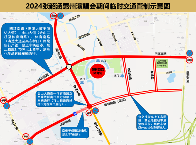 交通管制期間,市區(qū)四環(huán)南路(惠澳大道至演達(dá)大道)、金山大道(金山二橋至體育南路)、體育南路(演達(dá)大道至高布村口)路段實行嚴(yán)管,禁止車輛違停,禁止核載1.75噸以上貨車、危險化學(xué)品運輸車輛通行。