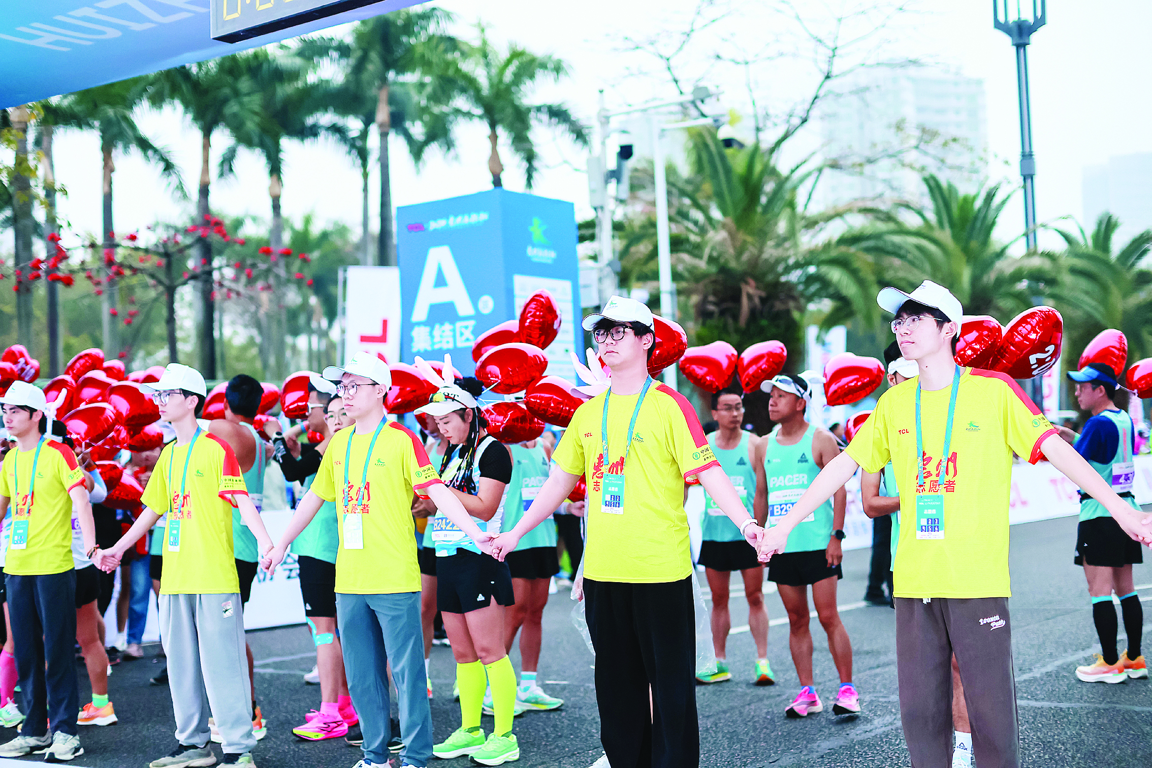 在今年3月17日舉行的惠州馬拉松賽中,不少志愿者在為賽事服務(wù)。