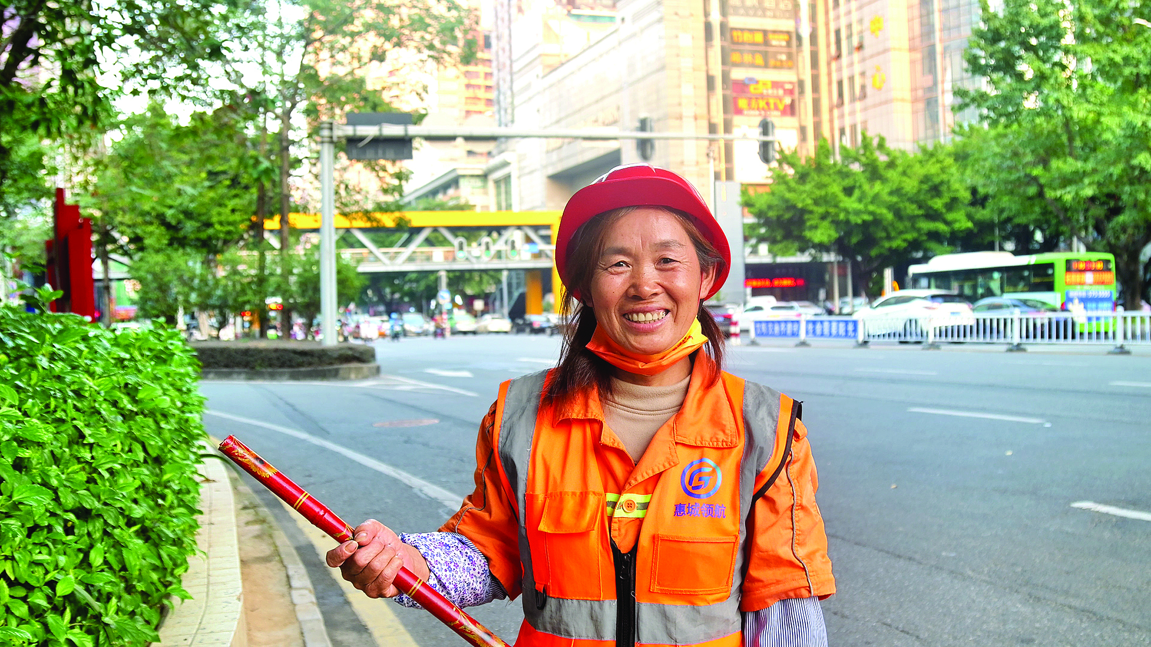 江衛(wèi)艷是廣西人,30多年前來到惠州,進(jìn)過工廠,干過保潔,2013年成為一名環(huán)衛(wèi)工人。“我記得當(dāng)時(shí)主管跟我們說,勞動(dòng)沒有高低貴賤之分,干一行愛一行就能贏得尊重!苯l(wèi)艷一直踏踏實(shí)實(shí)工作,把負(fù)責(zé)區(qū)域“每個(gè)角落都盡量搞干凈”,周邊的居民路過都會(huì)稱贊她“很能干,很負(fù)責(zé)!