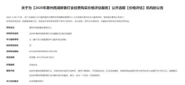 發(fā)布《關(guān)于為【2025年惠州西湖新春燈會(huì)經(jīng)費(fèi)購(gòu)買(mǎi)價(jià)格評(píng)估服務(wù)】