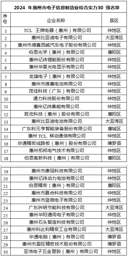其中,TCL王牌電器(惠州)有限公司、惠州比亞迪電子有限公司、惠州市德賽西威汽車電子股份有限公司位列2024年惠州市電子信息制造業(yè)綜合實(shí)力30強(qiáng)名單前三名;葜菔械涿履茉纯萍加邢薰尽V東科信聚力新能源有限公司、惠州市駿亞數(shù)字技術(shù)有限公司等20家企業(yè)獲評2024年惠州市電子信息制造業(yè)最具成長性企業(yè);葜菀暰S新技術(shù)有限公司等10家企業(yè)獲評2024年惠州市優(yōu)秀軟件和信息技術(shù)服務(wù)業(yè)企業(yè)。