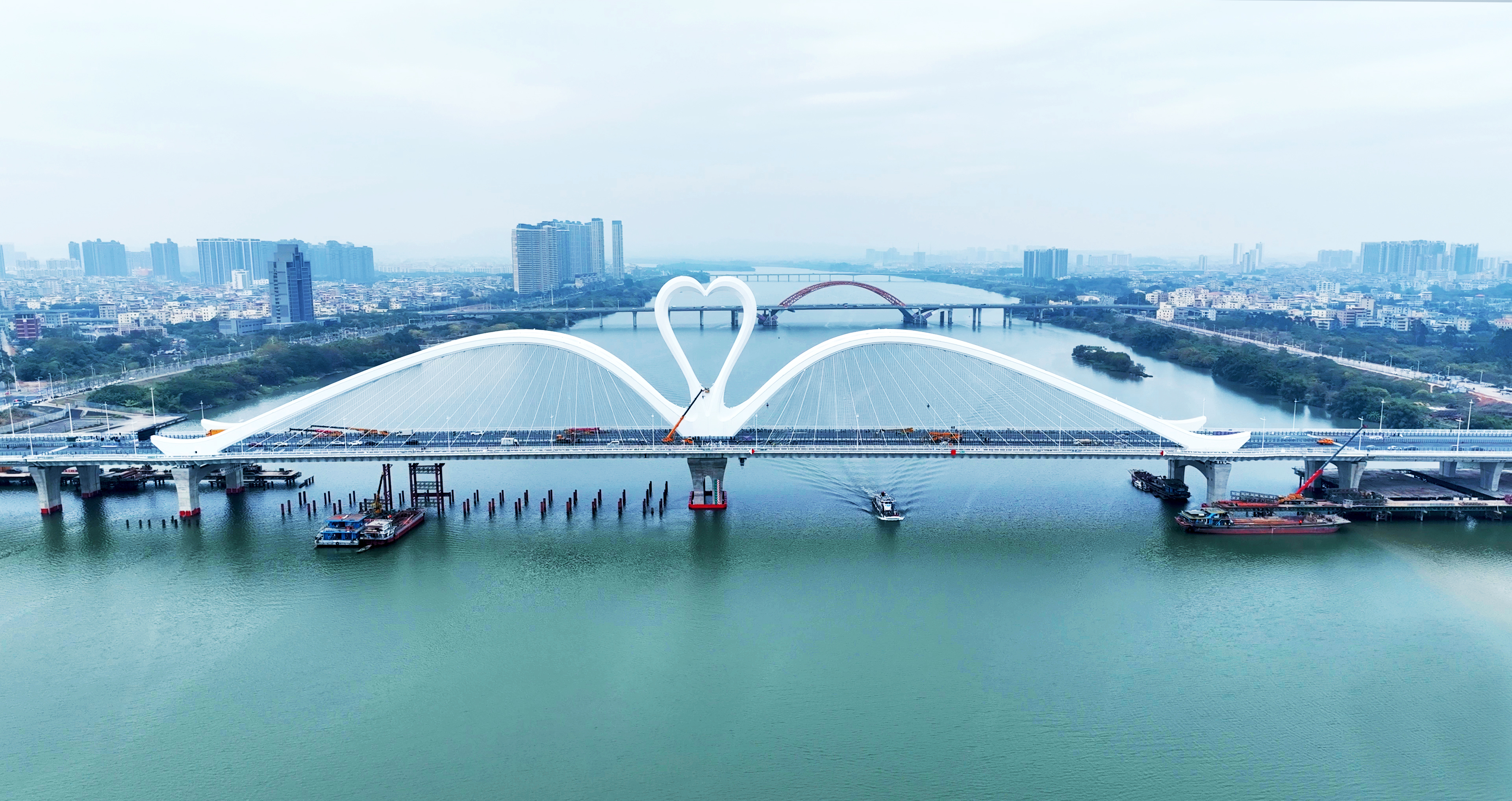 鵝城大橋位于惠州市惠城區(qū),主線全長2974米,包括主橋及相接道路,按雙向6車道設(shè)計,主跨180米,是國內(nèi)最大的空間斜跨偏態(tài)系桿拱橋。其中,大橋全長1119米,起點位于江北惠州大道與期湖塘路交叉口,主線下穿菊花路,途經(jīng)期湖塘路,跨東江后,沿規(guī)劃同福路向東,終點為江東一號路。自2021年12月開工以來,項目建設(shè)團(tuán)隊嚴(yán)格把控工程質(zhì)量,結(jié)合實際情況不斷優(yōu)化施工方案,確保每個重要節(jié)點順利完成,最終實現(xiàn)通車目標(biāo)。