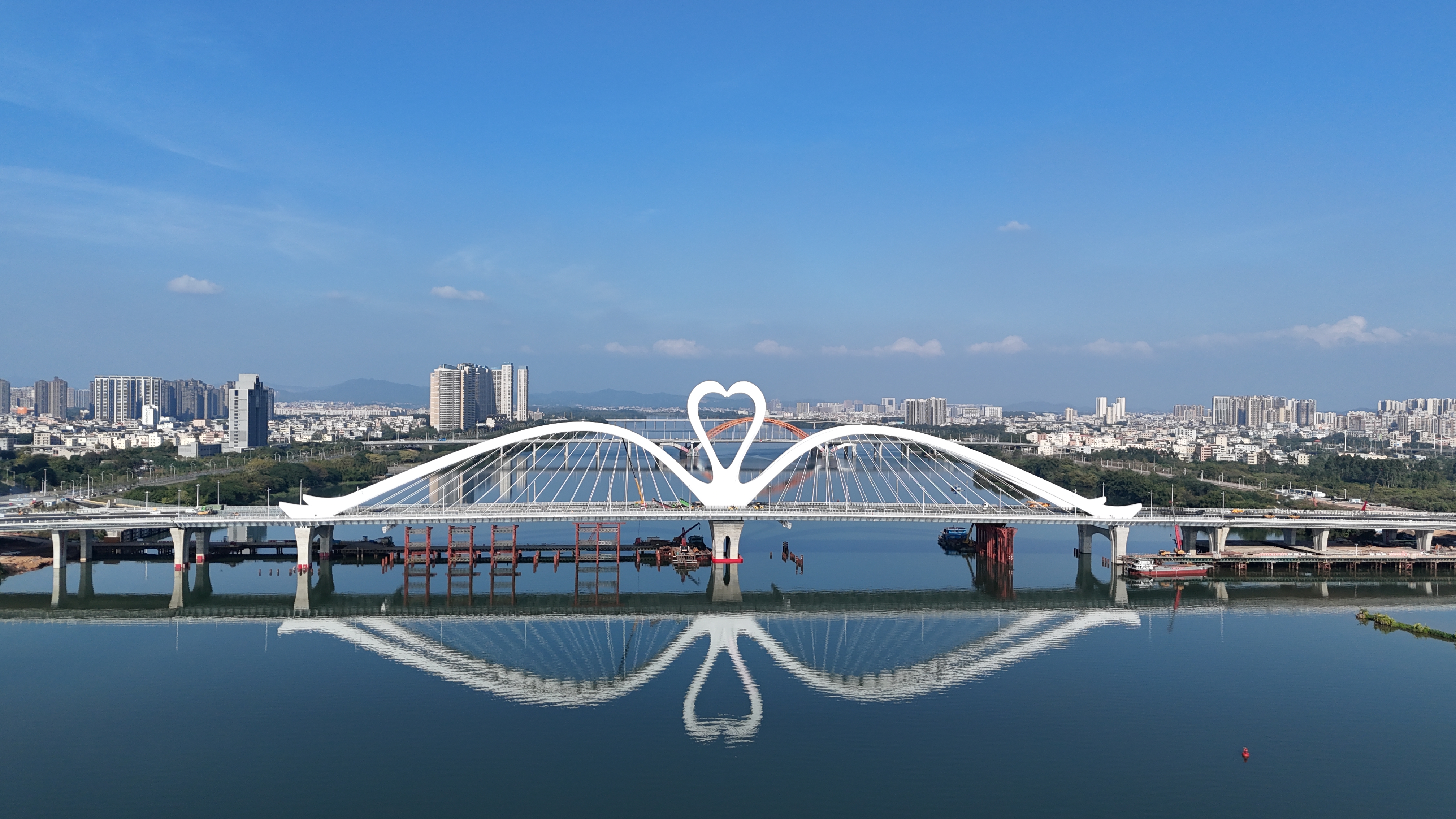 鵝城大橋位于惠州市惠城區(qū),于2021年12月開工建設,主線全長2974米,包括主橋及相接道路,按雙向6車道設計,大橋全長1119米,主跨180米,是國內(nèi)最大的空間斜跨偏態(tài)系桿拱橋。