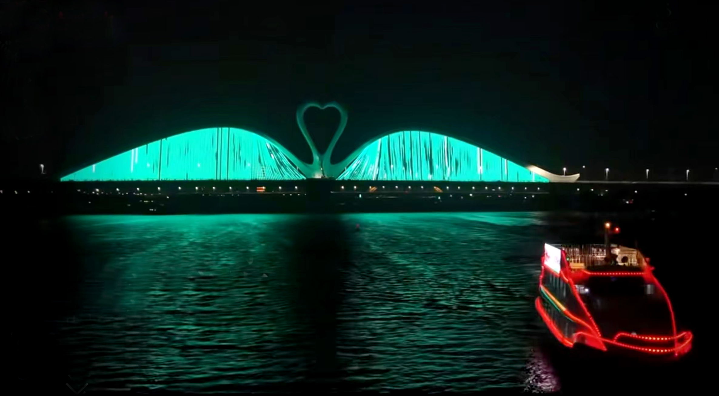 據(jù)介紹,鵝城大橋橋體安裝了157000點光源、5000盞洗墻燈、16臺激光燈。通車以后,定期有燈光展示。