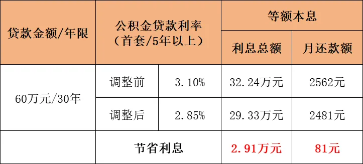 以當前我市普通職工家庭首套住房最高貸款60萬為例,貸款年限30年,采用等額本息還款方式,在利率調(diào)整后,總利息減少2.91萬元,每月還款額可減少81元。