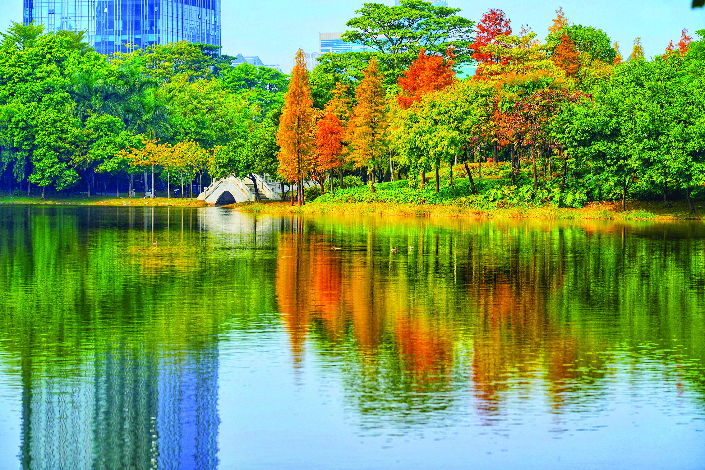 近日,位于市區(qū)江北北湖公園的落羽杉迎來(lái)了紅葉期。湖畔的落羽杉一團(tuán)團(tuán)、一簇簇,與水中倒影交相輝映,組成夢(mèng)幻般的色彩,讓冬日的惠州別有一番風(fēng)采,吸引游客紛紛前來(lái)打卡拍照。