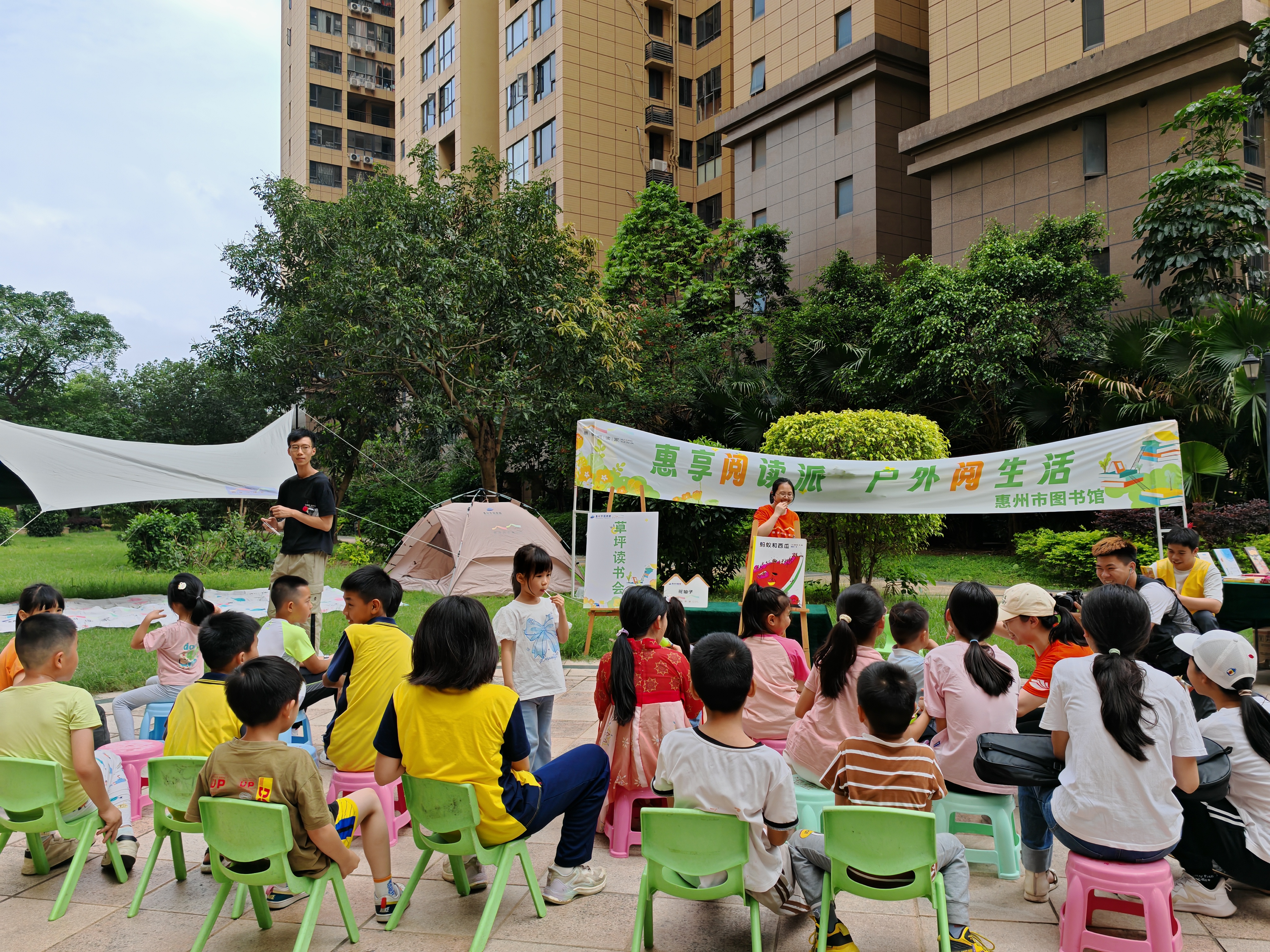 市圖書館走進(jìn)水口寶安山水龍城小區(qū)開(kāi)展“惠享閱讀派”戶外閱讀活動(dòng),花仙子·惠享閱讀家主理人分享繪本故事。