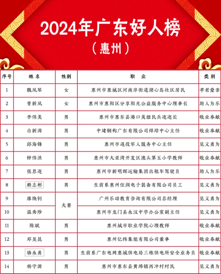 1月9日晚,2024年“廣東好人”發(fā)布暨文明實(shí)踐成果匯報(bào)活動(dòng)在廣州舉行。活動(dòng)現(xiàn)場(chǎng)發(fā)布了2024年助人為樂、見義勇為、誠(chéng)實(shí)守信、敬業(yè)奉獻(xiàn)、孝老愛親五個(gè)類別共196名“廣東好人”名單。其中,惠州14人獲評(píng)“廣東好人”榮譽(yù)稱號(hào)。