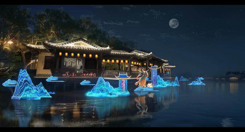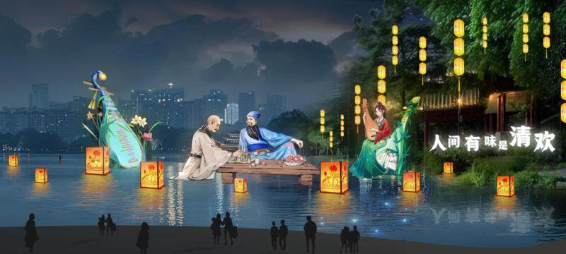 燈組“千年之約”場景設計來源于蘇東坡寓惠兩年多對惠州巨大的貢獻,充分利用東坡、朝云、亭山樓閣等元素,營造出“天上宮闕”般的場景,如夢如幻仿佛穿越時空回到一千年前,與東坡有個跨越時空的約定。