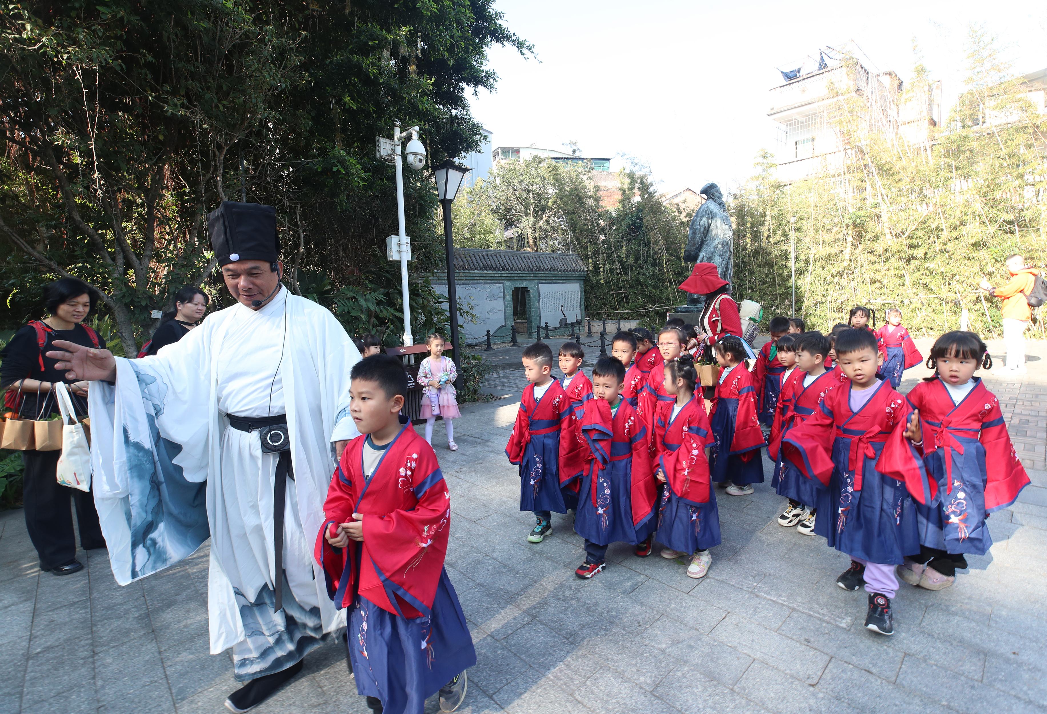 志愿者穿漢服扮演蘇東坡在惠州蘇東坡祠為研學(xué)團(tuán)隊(duì)提供義務(wù)講解服務(wù)。 惠州日?qǐng)?bào)記者鐘暢新 攝