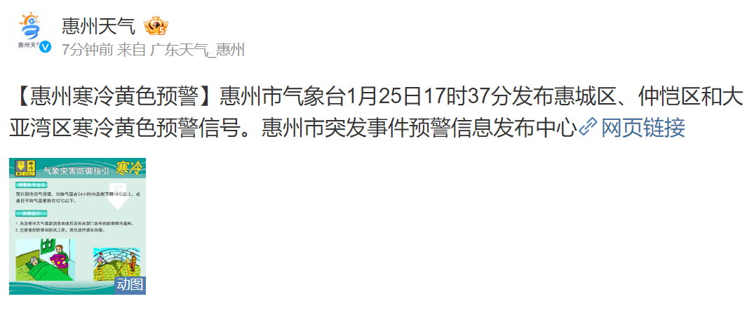 惠州發(fā)布寒冷黃色預(yù)警受強(qiáng)冷空氣影響,預(yù)計(jì)未來(lái)24小時(shí)我市氣溫明顯下降,海陸風(fēng)力增大,惠州市氣象臺(tái)1月25日17時(shí)37分發(fā)布惠城區(qū)、仲愷區(qū)和大亞灣區(qū)寒冷黃色預(yù)警信號(hào),請(qǐng)注意防御;葜菔型话l(fā)事件預(yù)警信息發(fā)布中心