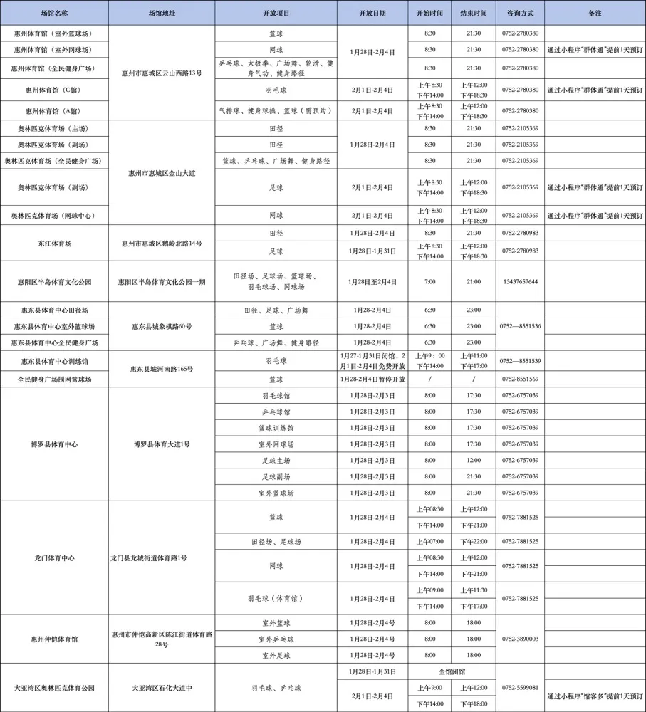 惠州體育館A館、C館,惠州奧林匹克體育場副場足球場、網(wǎng)球中心,從1月28日至31日(除夕至年初三)暫停開放。