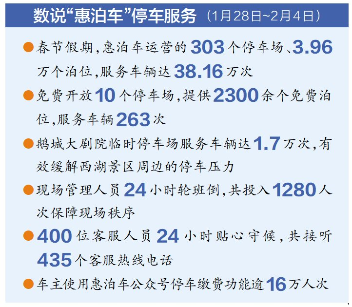 春節(jié)假期,“惠泊車”運營的303個停車場、3.96萬個泊位,共服務車輛達38.16萬次,通過各項有力的舉措,市民出行的滿意度和幸福感大大提高。