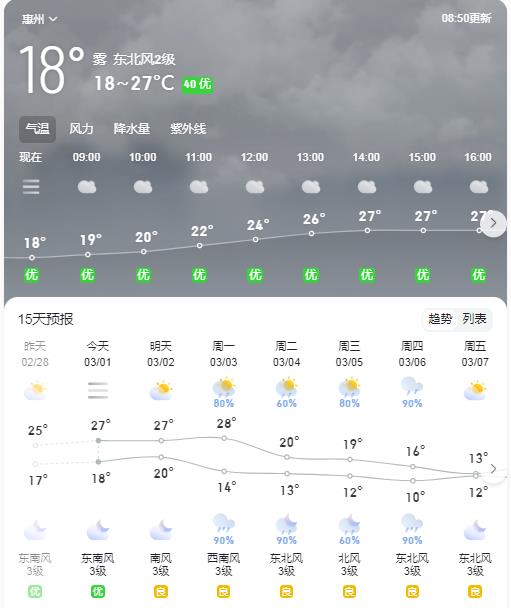 據(jù)惠州市氣象臺(tái)預(yù)計(jì),3月1日-3日白天我市天氣暖濕,早晚有(輕)霧,各地伴有不同程度的“回南天”,最低氣溫17~21℃,最高氣溫26~28℃;3日傍晚-4日,受冷空氣影響我市有一次降溫降雨過(guò)程,北部有中到大雨局部暴雨,中南部有小到中雨,局地伴有雷電和6~8級(jí)短時(shí)大風(fēng)等強(qiáng)對(duì)流天氣,氣溫14~19℃;5日,陰天,有小雨局部中雨,氣溫13~18℃。