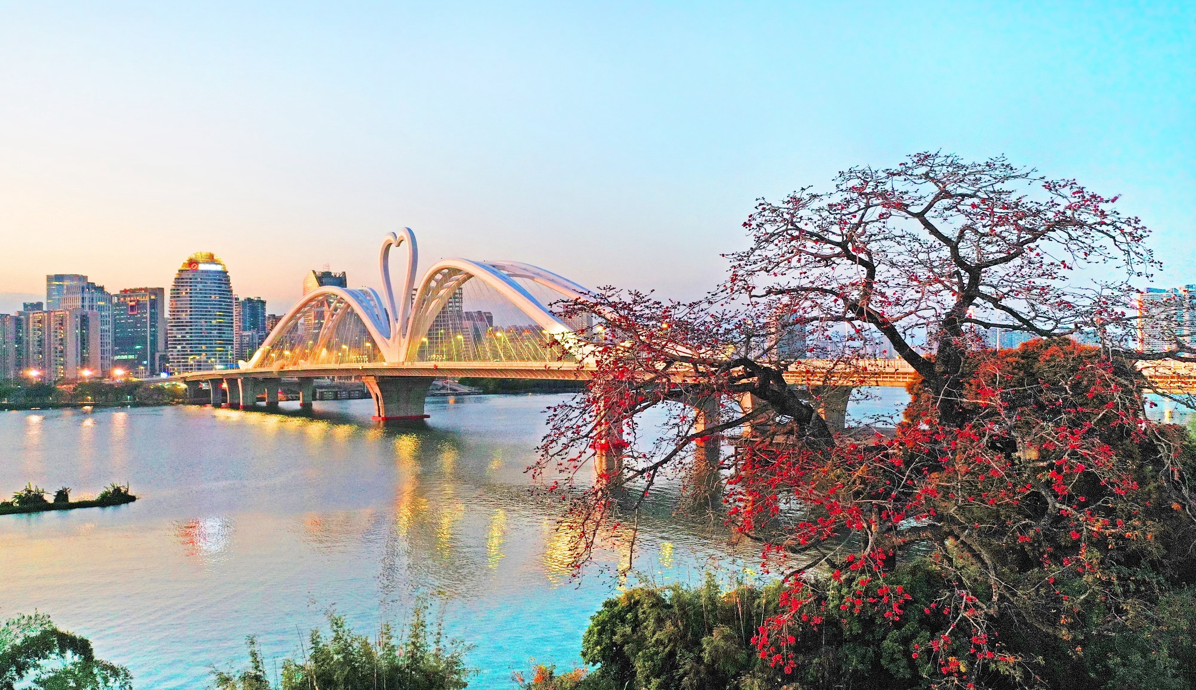 鵝城大橋下游南岸,有棵320多年樹齡的木棉樹,高大又挺拔。它的枝頭掛滿花雷,三分之一的花朵已然綻放,紅得濃烈。木棉樹與鵝城大橋相互映襯,古樸與明艷交織,成了一幅絕美春景圖,引得路人紛紛駐足欣賞。