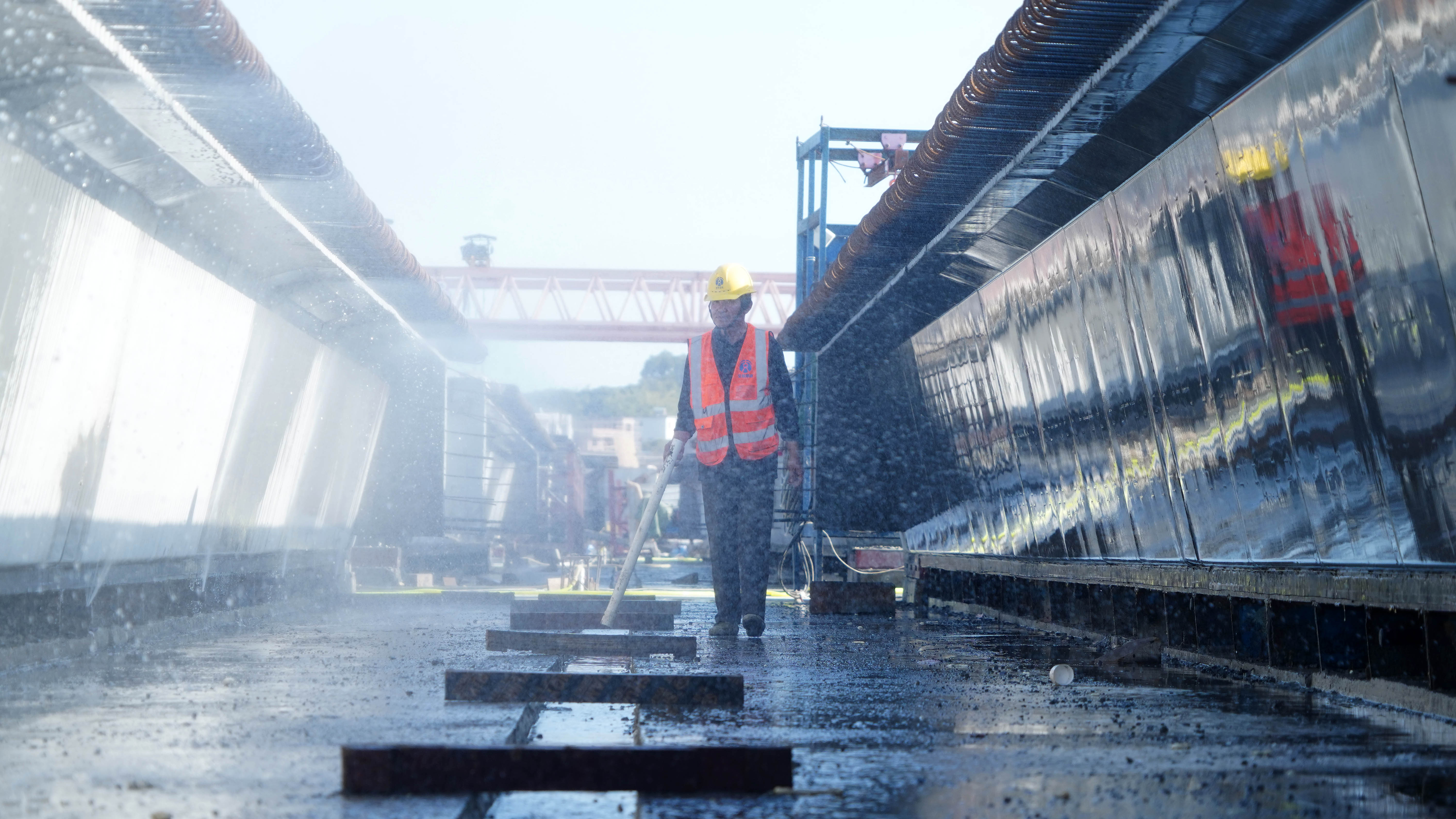 在7號制梁場,一片片預制梁整齊地擺放在場內(nèi),工人正在進行預制梁養(yǎng)護。
