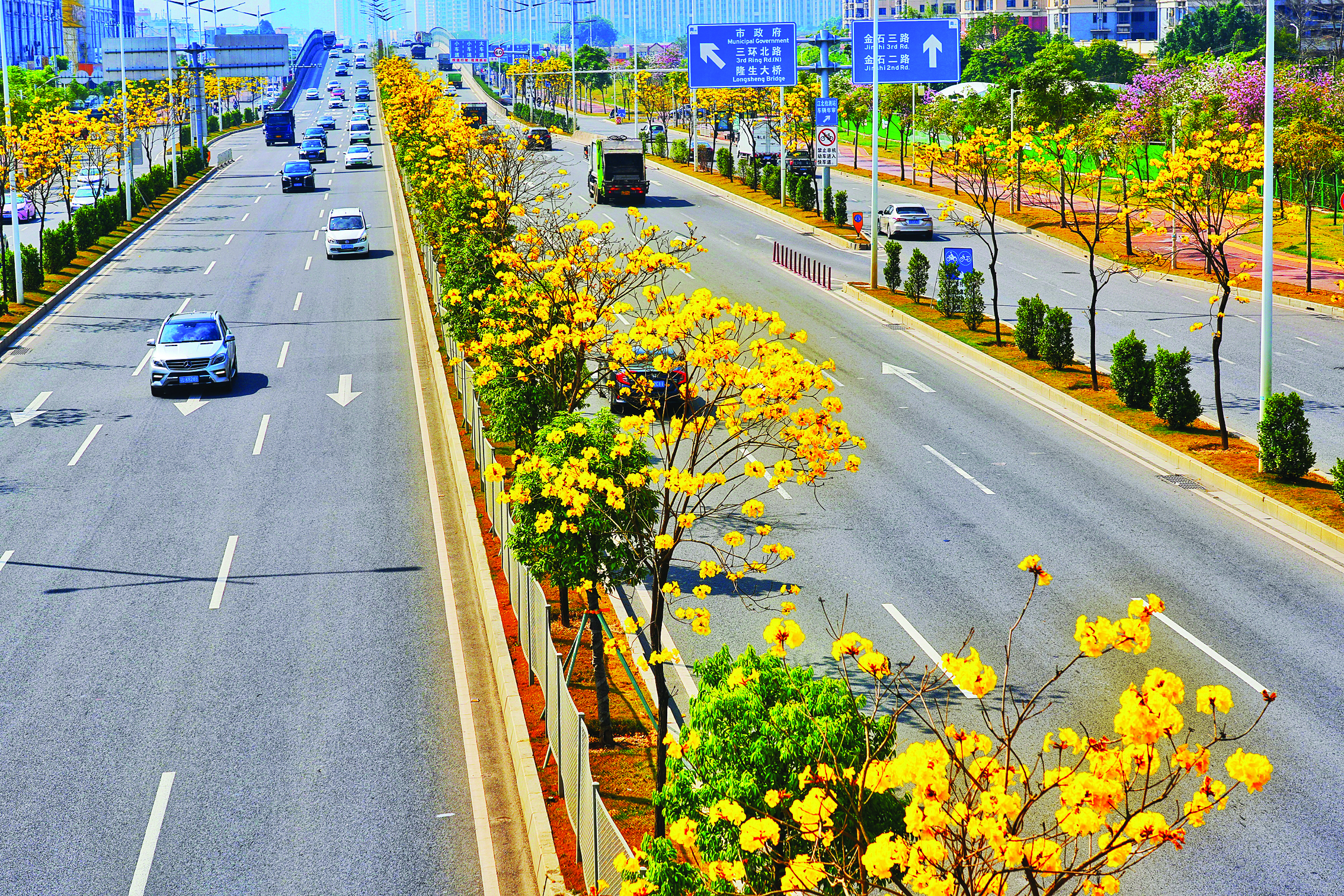 春意漸濃,當(dāng)下正值黃花風(fēng)鈴木盛開之季,在金龍大道快速路上,黃花風(fēng)鈴木金黃色彩點(diǎn)綴其中,為金龍大道注入了源源不斷的生機(jī),形成了一道亮麗的風(fēng)景線;葜萑請笥浾咧旖鹳 周智聰 攝