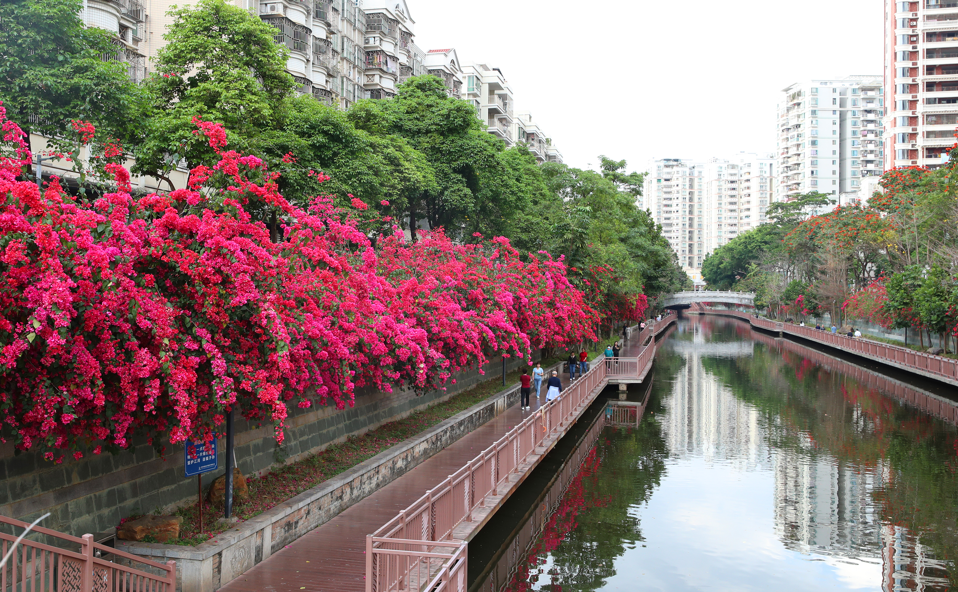 春天,草長鶯飛,百花盛開;葜菔袇^(qū)金山河沿岸的三角梅近日競相開放,春意盎然,嬌艷的花朵仿佛給金山河兩岸“戴”上了一條美麗的花帶,一路繁花錯落有致,美得令人心醉,成為了市區(qū)一道亮麗的景觀。連日來,金山河畔吸引了大量市民和游客前來打卡。