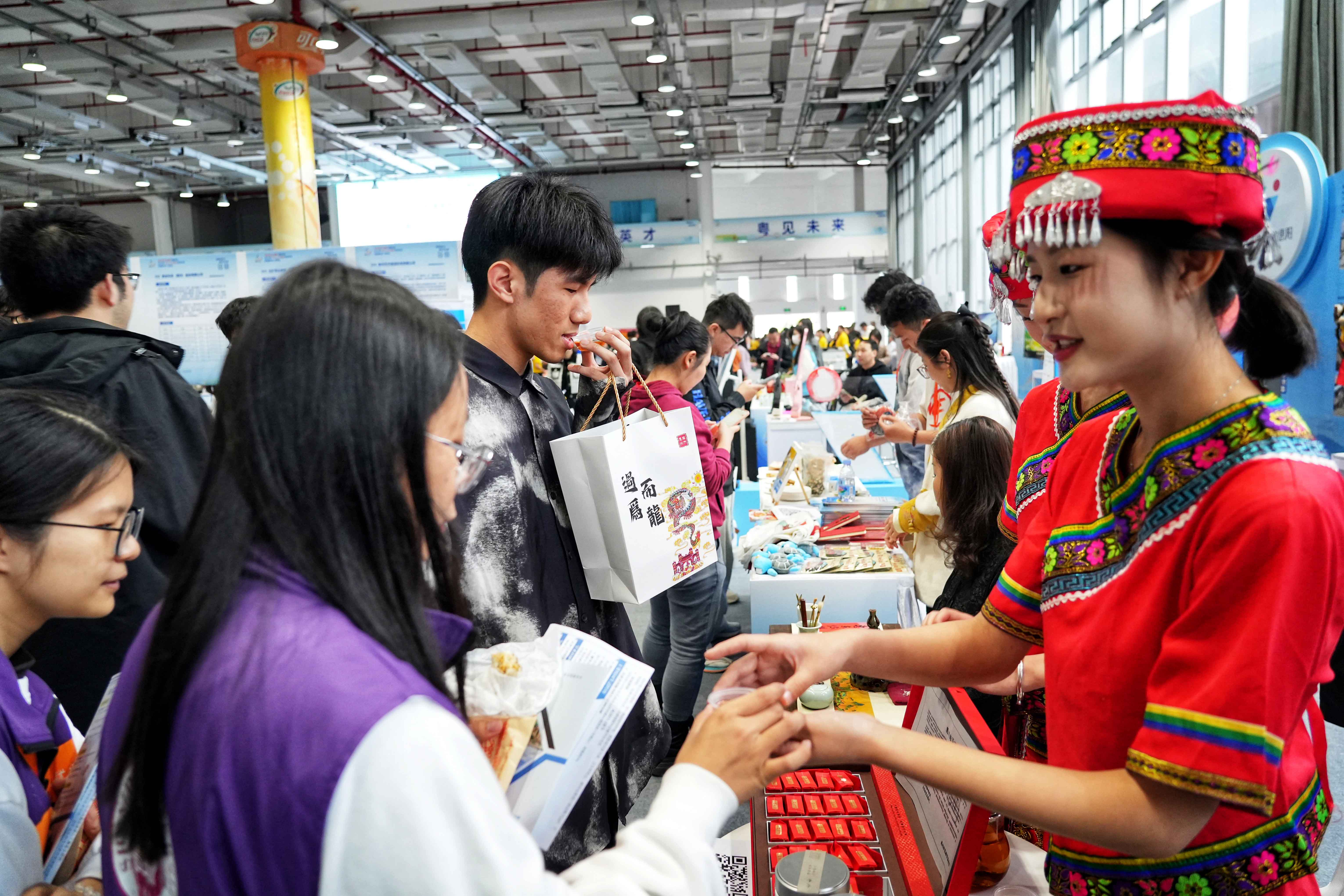 工作人員身著少數(shù)民族服飾助力招聘會(huì)引才。