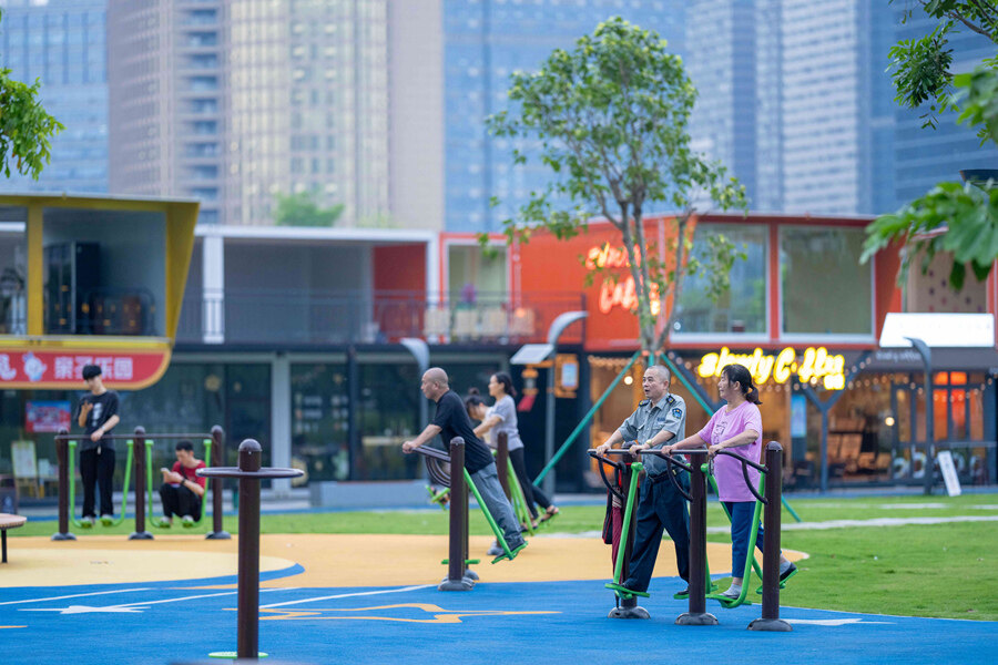 人們?cè)谑忻窆珗@休閑健身區(qū)域鍛煉;葜輺|江圖片社供圖