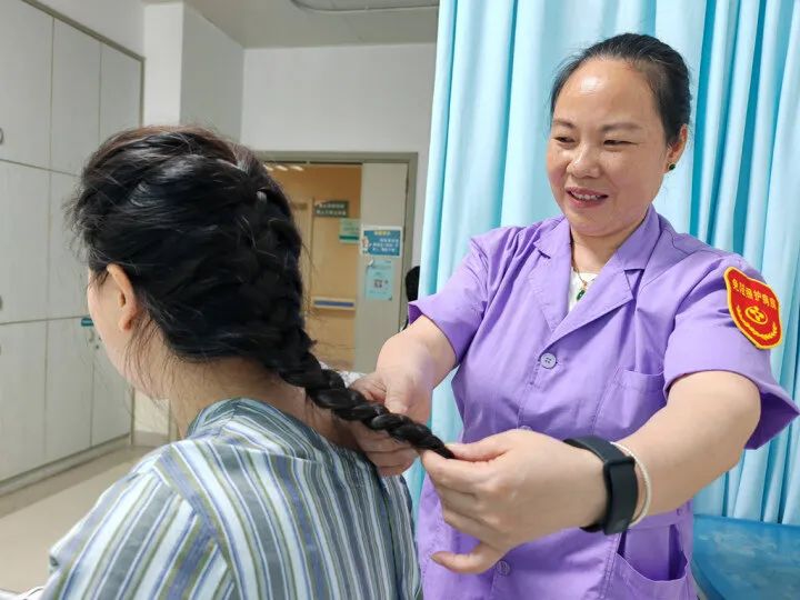 護(hù)理員在閑暇之時(shí)給患者梳辮子,讓患者心情更好。