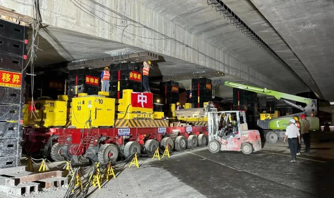 考慮到金龍大道車流量大、貨車多,周邊樓房密集,為確保安全、高效施工,項(xiàng)目選擇SPMT模塊車搭配液壓升降系統(tǒng),讓拆橋工作更智慧。該工藝通過(guò)智慧頂升系統(tǒng)將橋梁同步抬起、下降,再由模塊車精準(zhǔn)移動(dòng)整體結(jié)構(gòu),在實(shí)現(xiàn)快速拆橋的同時(shí),無(wú)需全封閉地方交通,還避免了傳統(tǒng)爆破施工帶來(lái)的粉塵和噪音污染,更加綠色環(huán)保。