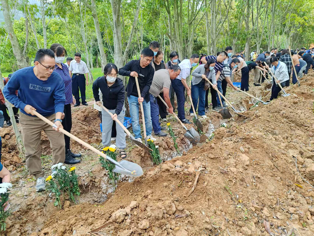 當(dāng)天上午共有133個(gè)家庭親臨現(xiàn)場(chǎng)、約300人前來(lái)惠州市殯儀館樹(shù)葬區(qū)參加綠色生態(tài)樹(shù)葬活動(dòng);顒(dòng)現(xiàn)場(chǎng),氣氛莊嚴(yán)肅穆,親屬們行鞠躬禮、默哀等后手捧骨灰壇盒,緩步至寧?kù)o祥和的生態(tài)樹(shù)葬區(qū),逝者的家人將骨灰盒放進(jìn)樹(shù)溝,撒下花瓣,蓋上泥土,低頭默哀,以環(huán)保節(jié)儉的方式,送先人落葉歸根,入土為安,讓他們永恒地回歸自然生態(tài),在青山綠水間安然入夢(mèng),在綠色中延續(xù)永生。市民政局為每個(gè)參與樹(shù)葬活動(dòng)的家庭頒發(fā)了樹(shù)葬證書。