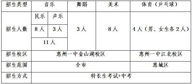 2025年惠州市第一中學(xué)金山湖校區(qū)計(jì)劃面向全市2025屆初中應(yīng)屆畢業(yè)生招收美術(shù)8人、音樂(lè)11人、舞蹈3人;惠州市第一中學(xué)江北校區(qū)計(jì)劃面向惠城區(qū)2025屆初中應(yīng)屆畢業(yè)生招收體育特長(zhǎng)生(乒乓球)4人。