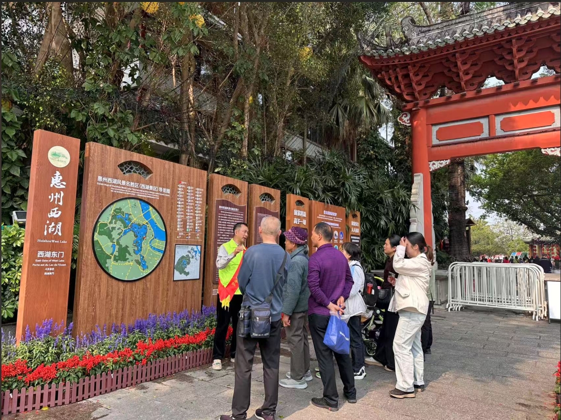 志愿者在惠州西湖為游客作講解;葜萑請笥浾唏槆t 攝