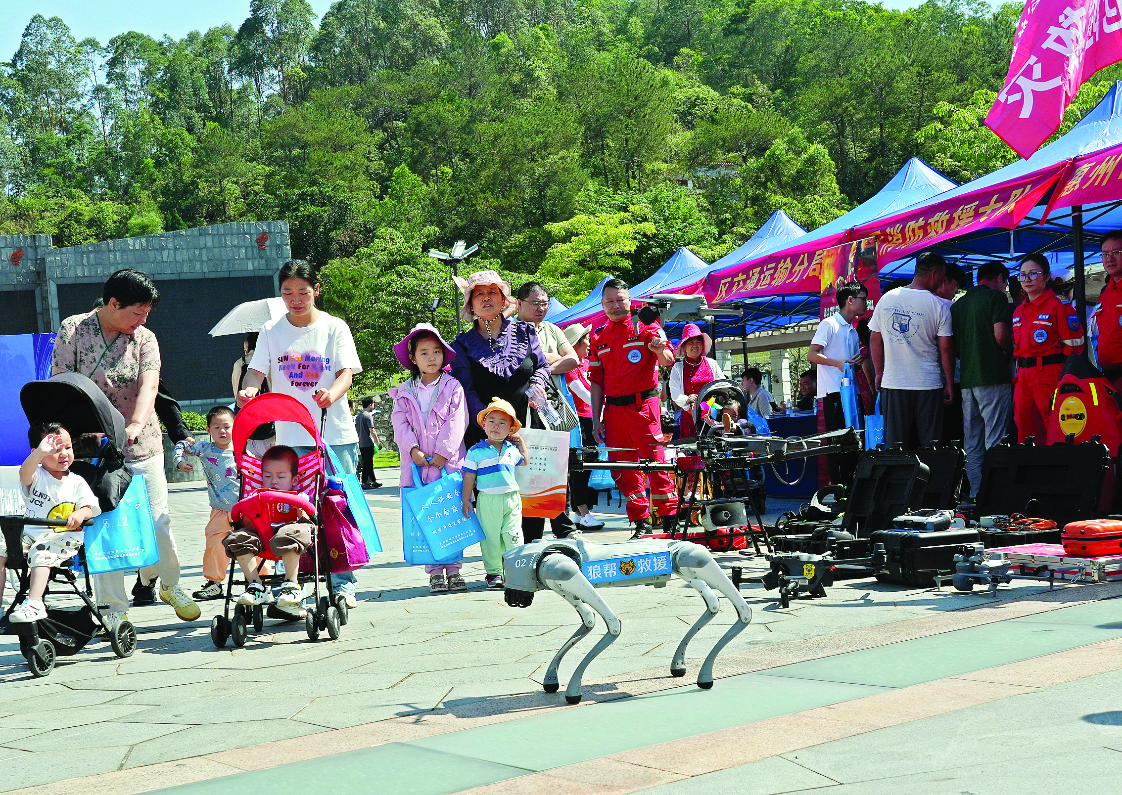 活動現(xiàn)場,市、仲愷區(qū)減災委有關成員單位設立咨詢展臺,普及防災減災救災相關政策法規(guī)和防災避險等知識。同時,設置應急救援科目演練區(qū)、展板講解區(qū)、裝備展示臺等活動區(qū)域,開展急救技能演示、管供式水下潛水搜救演練裝備展示、機器狗展示、熱成像無人機展示、無人機拋投功能展示等活動,市民通過“沉浸式”學習防災減災救災相關知識,提升自救互救技能。
