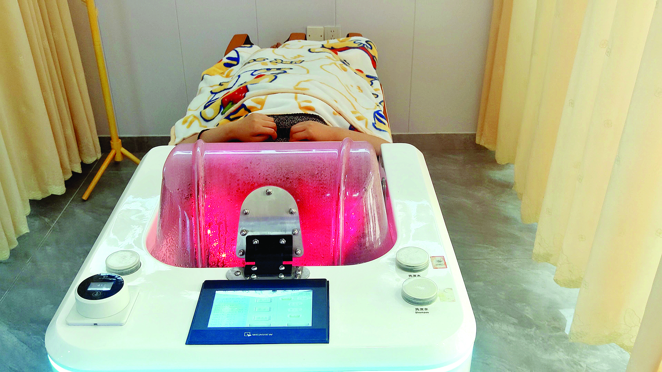 檢測完成后,店員根據(jù)顧客頭皮、發(fā)質(zhì)情況,啟動(dòng)AI洗頭設(shè)備。記者面前的AI洗頭機(jī)器集身體按摩和頭部自動(dòng)洗頭于一體,店員在操作面板前選擇需要的服務(wù)類型,為顧客遞上一次性耳塞,調(diào)節(jié)好合適的水溫水壓后就開始AI自動(dòng)洗頭。顧客可選擇速洗、普通、加時(shí)、淋水或養(yǎng)護(hù)等模式,力度有低、中、高三檔,還能根據(jù)頭發(fā)長度選擇長發(fā)或短發(fā)模式。洗頭過程中,機(jī)器內(nèi)部有一個(gè)淋浴器循環(huán)擺動(dòng)不斷調(diào)節(jié)方位,并通過紅外線燈精準(zhǔn)輸送水流,調(diào)節(jié)力度和溫度,實(shí)現(xiàn)全方位沖灑、清潔頭皮,“一共七次沖洗,主要通過水的脈沖來達(dá)到清洗頭部的效果,設(shè)備還設(shè)有按摩床,一邊洗頭,一邊對顧客進(jìn)行身體按摩,整個(gè)洗頭流程大約15分鐘。”店員介紹。