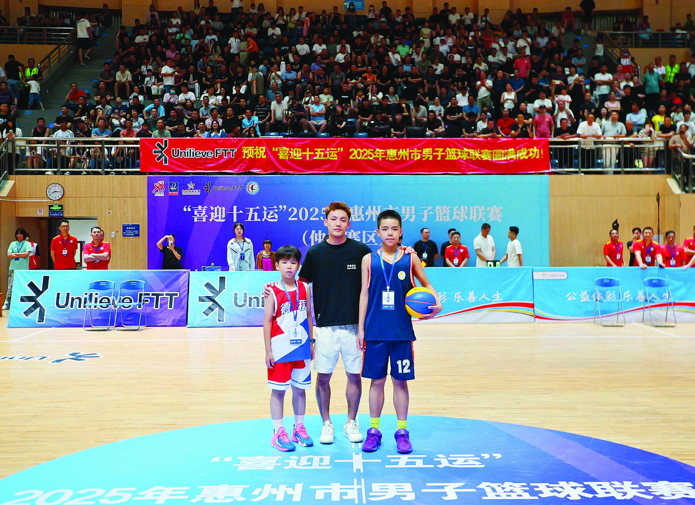 比賽現(xiàn)場(chǎng),徐杰和兩位籃球愛(ài)好者小朋友合照;葜萑?qǐng)?bào)記者黃鑫威 攝
