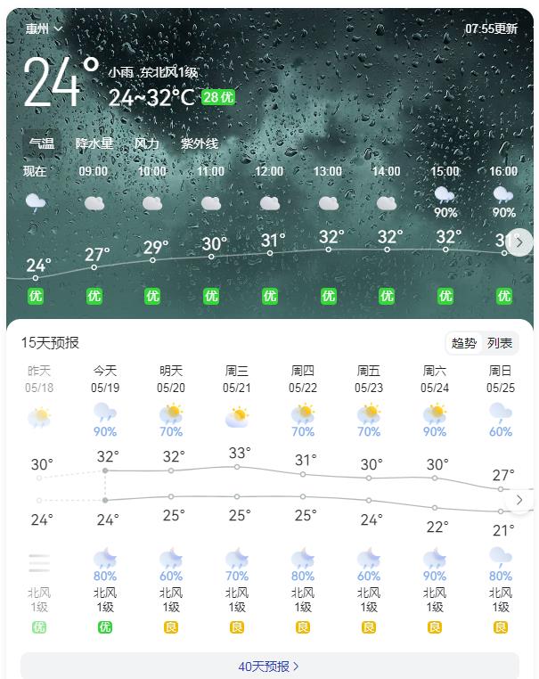 惠州日報訊 (記者劉建威 特約通訊員李佳曉)剛過去的周末,我市各地雷雨頻繁,局部大雨到暴雨。據(jù)市氣象臺預(yù)報,預(yù)計本周雷雨天氣頻繁,19~20日,多云到陰天,有(雷)陣雨局部大雨到暴雨,23~32℃;21日,多云間陰天,有(雷)陣雨,25~32℃;22~24日,多云間陰天,有分散(雷)陣雨,24~32℃。
