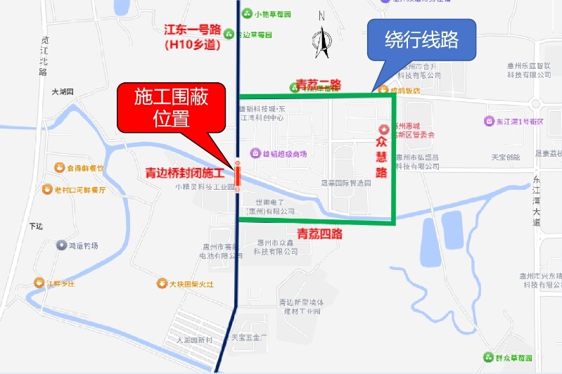 5月22日,惠州市公安局交警支隊(duì)發(fā)布《關(guān)于江東一號路青邊橋施工期間實(shí)施臨時(shí)交通管制的通告》。5月24日至施工結(jié)束(共約60天),惠城區(qū)江東一號路青邊橋禁止車輛(含非機(jī)動車)及行人通行。
