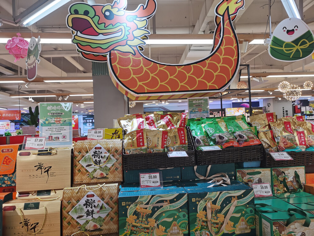 超市里各種粽子供應(yīng)充足,端午節(jié)日氣氛濃厚。